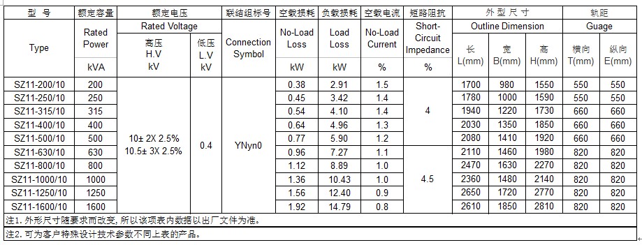 华屹集团10kV 630~6300kVA三相双绕组无励磁调压电力变压器性能参数表